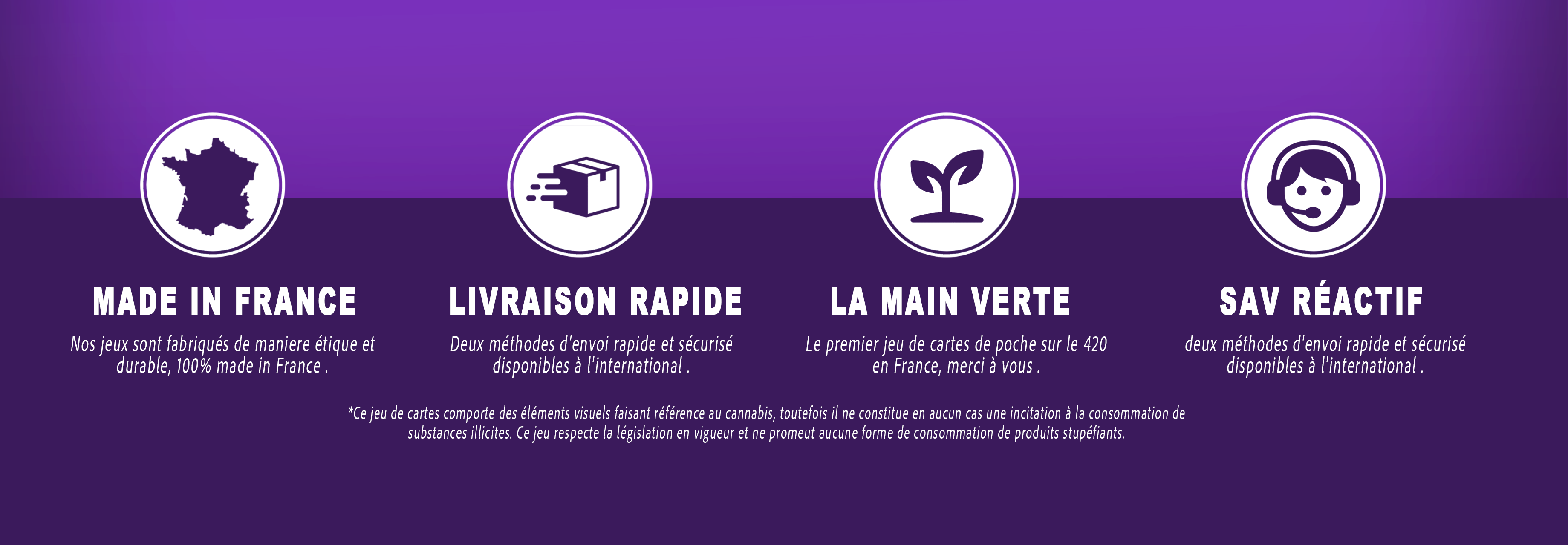 Nous sommes une jeune start-up française, née de la volonté de créer un jeu de cartes original, ancré dans la culture contemporaine. Après plus de deux ans de développement, nous sommes fiers de présenter le premier jeu de cartes en France entièrement dédié à l’univers du cannabis.